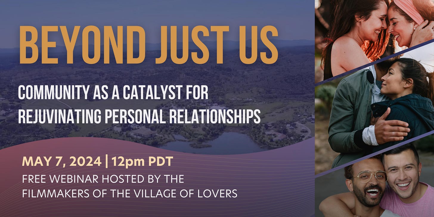 Additionally, I wanted to share that Ian Mackenzie, Julia Maryanska and myself (the team behind our documentary film, The Village of Lovers) are hosting two free upcoming webinars on the power of love, sexuality and conscious relationships to become the warp and weft of community.